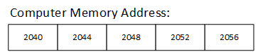 Now let’s assume our array’s first element starts at the memory address 2040. Then the next element will be at the address 2044, the third at 2048, fourth at 2052 and the last at address 2056. That results in our array allocating memory from address 2040-2059 and the next available memory address starting at 2060.